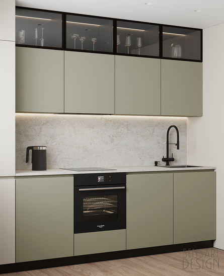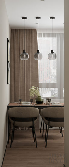Квартира оформлена в природных оттенках с использованием натуральных материалов. Заказчица ведёт активный образ жизни, а дома предпочитает отдыхать в спокойной атмосфере.